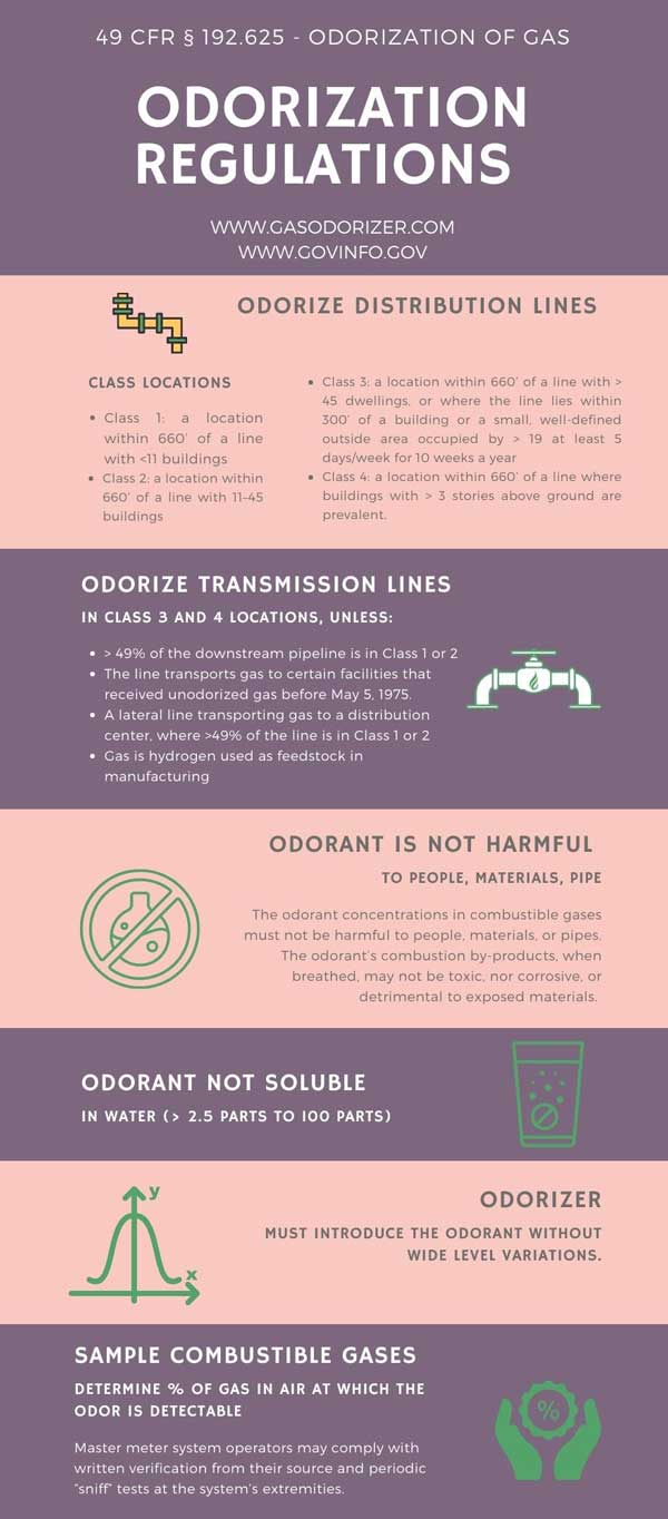 What are the natural gas odorization regulations? Plain and simple, in the U.S., any odorless gas within a distribution or transmission line (exceptions noted in the rules*) must contain odorant at the level of 20% or 1/5 the lower explosive limit so that a person with an ordinary sense of smell can detect it.